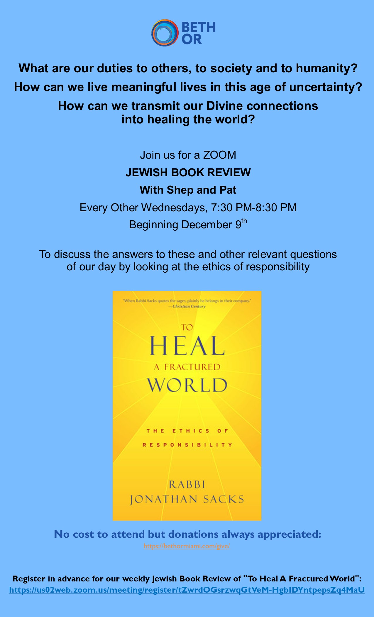 Join Shep Faber and Pat Barron as they lead a discussion every other Wednesday on Rabbi Jonathan Sacks book, Heal A Fractured […]