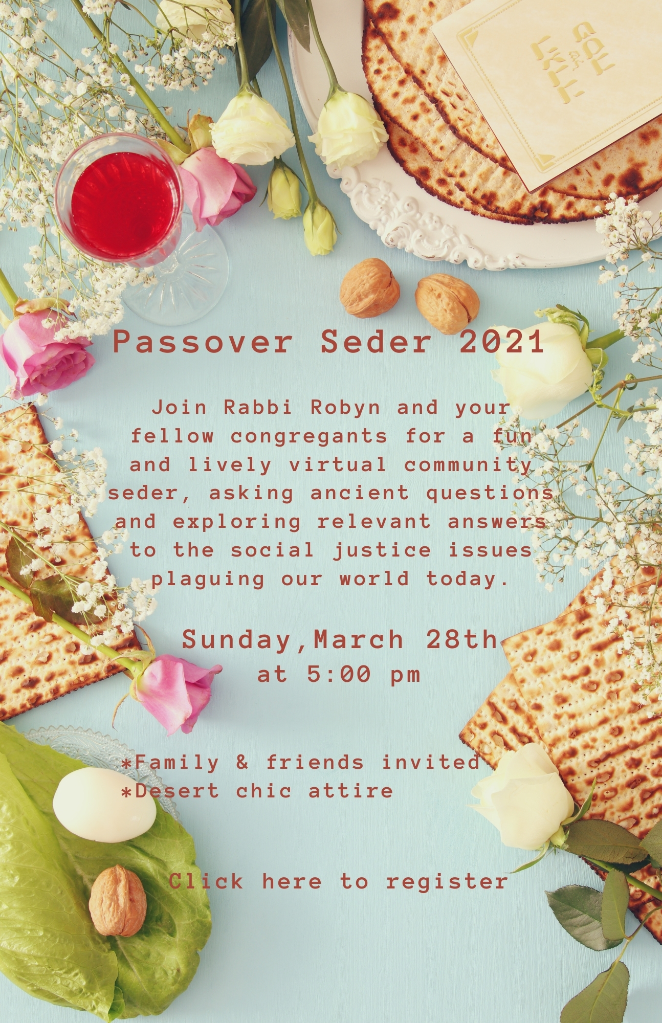 Beth Or, 11715 SW 87th Ave, Miami, FL 33176, USA 8901 SW 87th Ct, United StatesJoin Rabbi Robyn and your fellow congregants for a fun and lively virtual community seder. Family and friends are invited. Please register